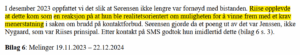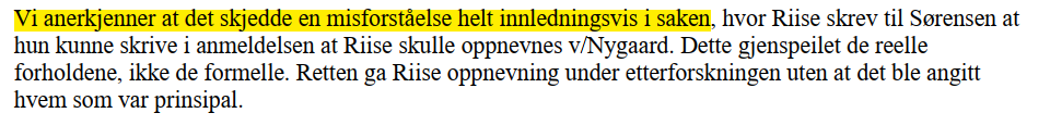 «Lovnaden fra Nygaard om å samarbeide med en fullmektig, og å følge saken tett, er blitt fulgt opp. Når Sørensen har ønsket det, har også Nygaard personlig tatt kontakt med henne. Vi mener det må anses helt klart at Sørensen har vært informert om hvem som har veiledet Riise i saken.»