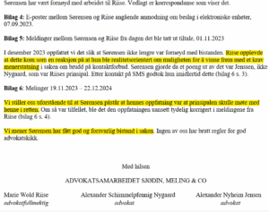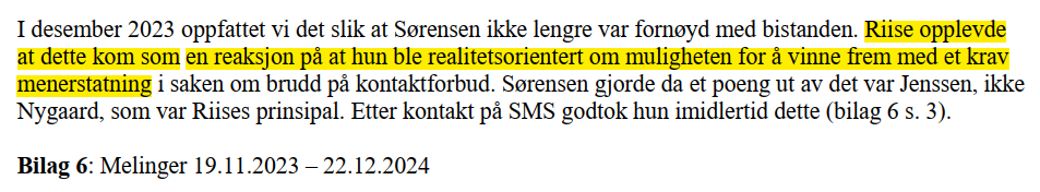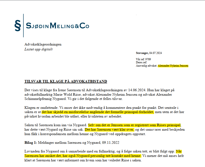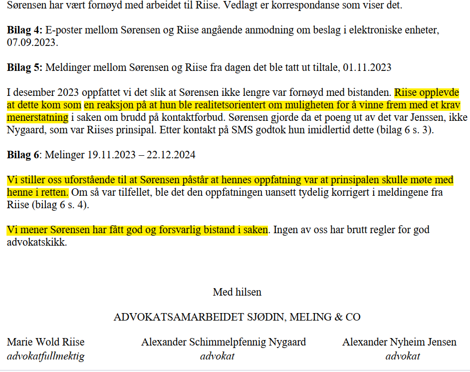 «Klagen er omfattende. Vi anser det ikke nødvendig å kommentere den punkt for punkt. Det sentrale i saken er at det har skjedd en misforståelse angående det formelle prinsipal-forholdet, men uten at det har påvirket hvordan arbeidet ble utført, eller kvaliteten av arbeidet. Saken til Sørensen kom inn via Nygaard. Selv om det er Jenssen som er registrert som Riises prinsipal, har dette vært Nygard og Riise sin sak. Det har Sørensen vært klar over, og det samsvarer med beskjeden hun fikk i korrespondansen mellom henne og Nygaard ved oppdragets oppstart.»