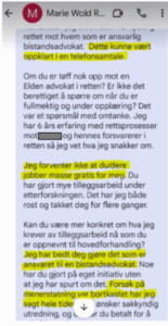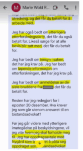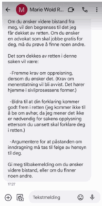 Resten av meldingen min er klippet bort ved den røde pilen. Jeg hadde fått en lang melding med beskyldninger og urimelig krav fra Riise, som avslutter med et spørsmål om jeg aksepterer det, eller finner meg en annen advokat. Jeg svarte at det ikke var noe problem dersom alt det formelle var i orden. Deretter imøtegikk jeg anklagene hennes og avsluttet med at jeg først og fremst ville ha en skriftlig bekreftelse på at Jenssen ikke var innblandet i saken.