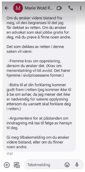 Første gang jeg ga utrykk for mistillit til  advokat Jenssen var i august 2022. Neste gang jeg sa at jeg ikke ville ha advokat Jenssen innblandet i saken min var 30 november 2022. Deretter i oktober 2023, november og desember 2023. Utallige ganger ba jeg om bekreftelse på at han ikke hadde noe med min sak å gjøre.
