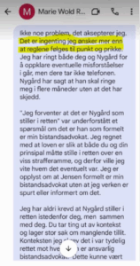 For å dokumentere det vedlegger advokat Nygaard et dokument med 7 bilder av dialogen mellom meg og Riise som skal bevise at jeg aksepterte «ordningen». Og klipper bort der jeg klart sier at jeg ikke gjør det.