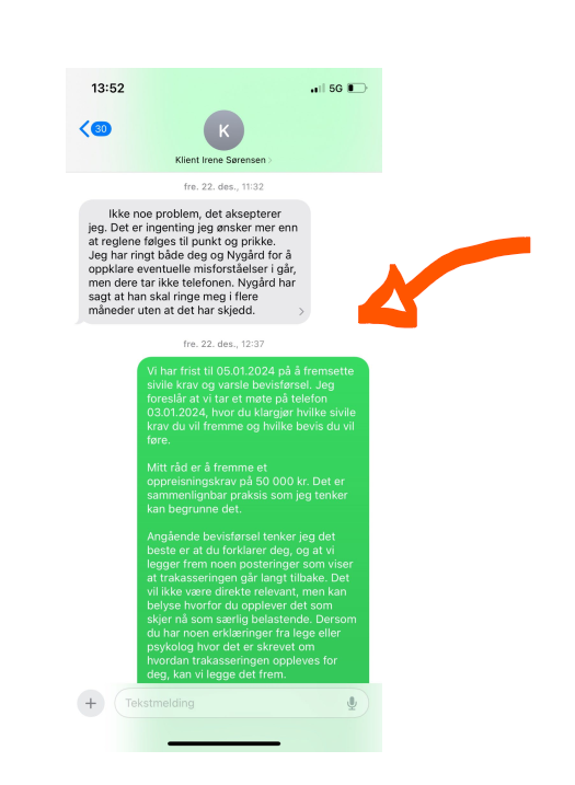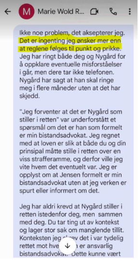 Nygaard beskriver en skriftlig oppdragsavtale som en «lovnad», og hevder at han ville følge saken tett. Hvilket han ikke gjorde. Tidslinjen viser at han første gang tok kontakt et år etter oppdragsavtalen. Ei heller ringte han noen gang tilbake når jeg ringte han. Jeg har aldri snakket med Nygaard.  Som bevis på personlig kontakt har han vedlagt bilde «eksempel på kontakt», på første gang han svarte meg, 30.11.2023.