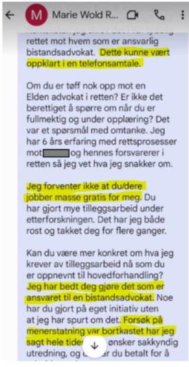 -Jeg lister opp det jeg har bedt om, og viser til at det er hennes plikter som bistandsadvokat som hun får betalt for.